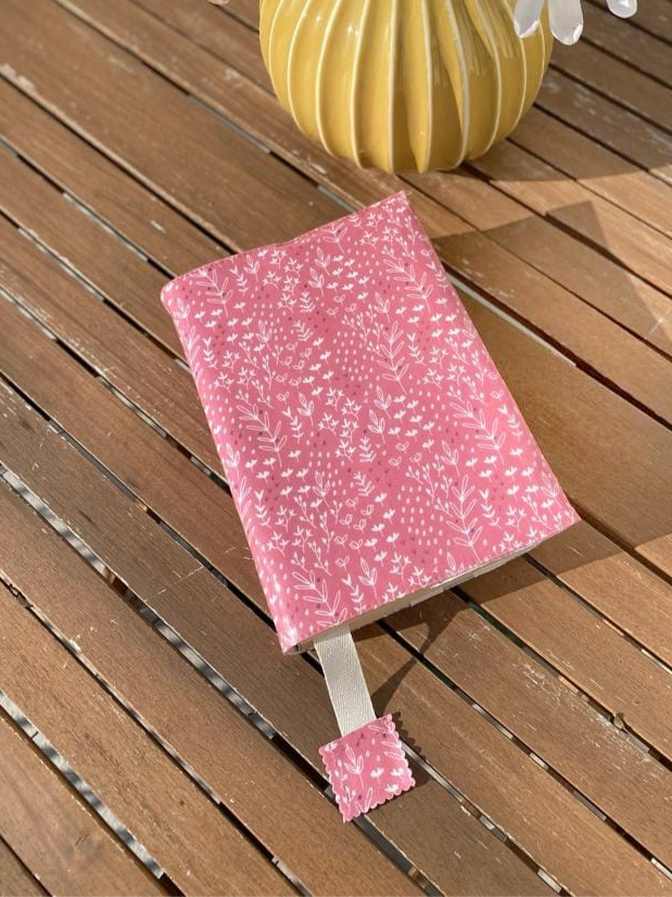 Capa de livro com marcador, ajustavel, em tecido impermeavel no exterior algodão no interior.